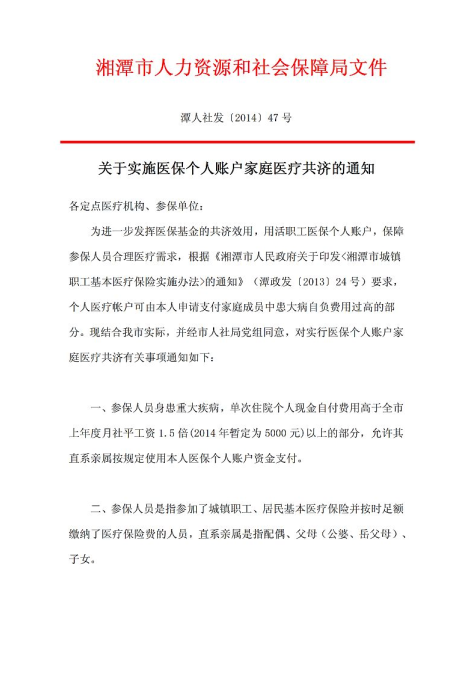 關(guān)于實施醫(yī)保個人賬戶家庭醫(yī)療共濟的通知