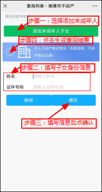 ⑸. 如需添加未成年人請點擊“添加未成年子女”后輸入身份信息并點擊確認(rèn),再點擊“本人不動產(chǎn)登記情況”